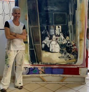 Saltou-me aos olhos o branco do sorriso e dos cabelos em diálogo harmonioso com a sua percepção da obra feita por um certo Sr. Velásquez. Mais evidente ainda o branco flagrado na vestimenta de trabalho, utilizada como suporte útil para as muitas pinceladas de cores inúmeras.